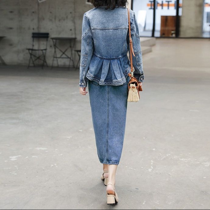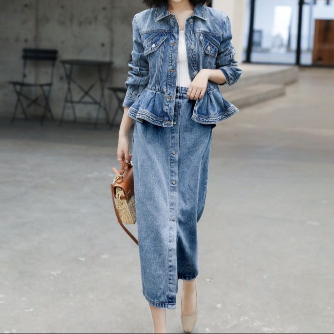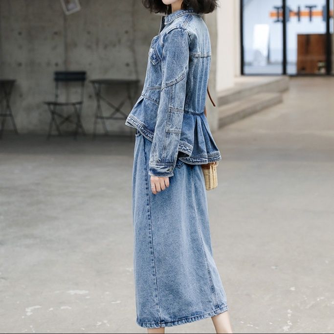 トレンド感のあるペプラムデザインのデニムジャケットとフロントボタンのロングスカートが魅力的なデニムセットアップです。