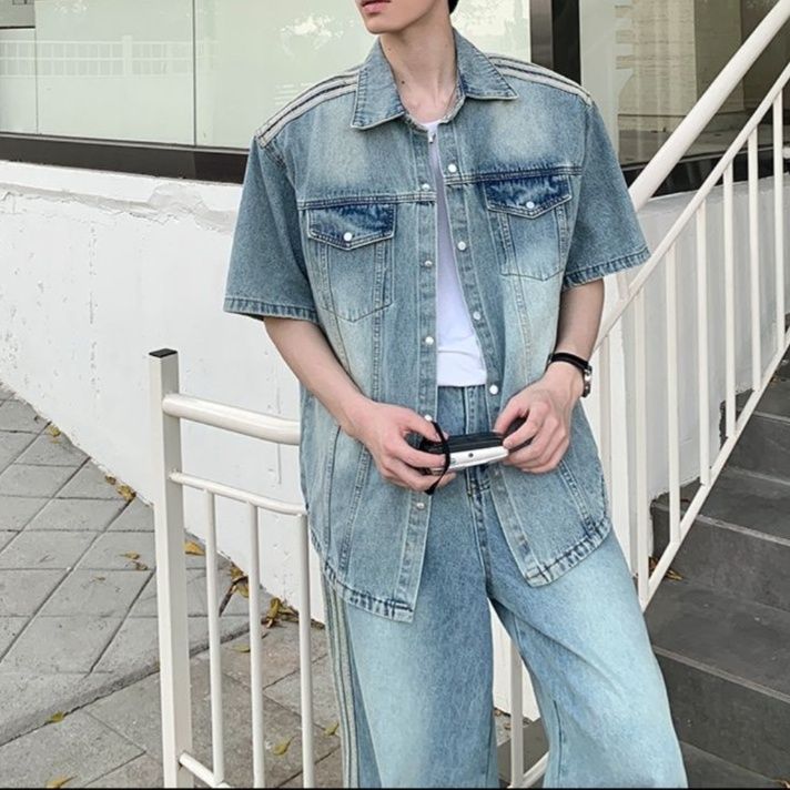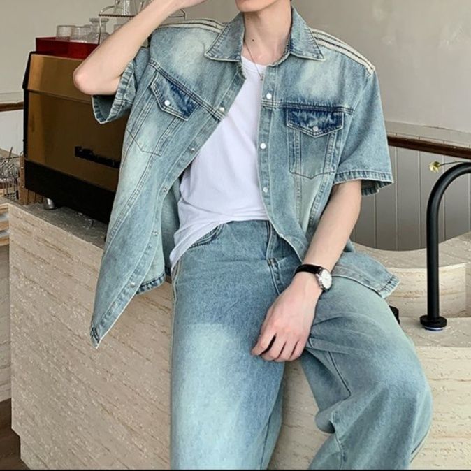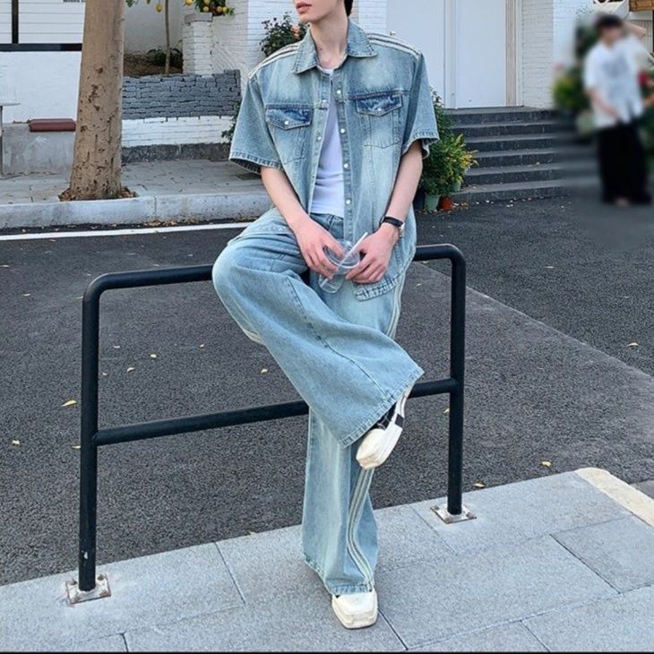 胸ポケット付きのシャツと裾に向かって広がるワイドパンツの組み合わせが洗練された雰囲気を演出します。