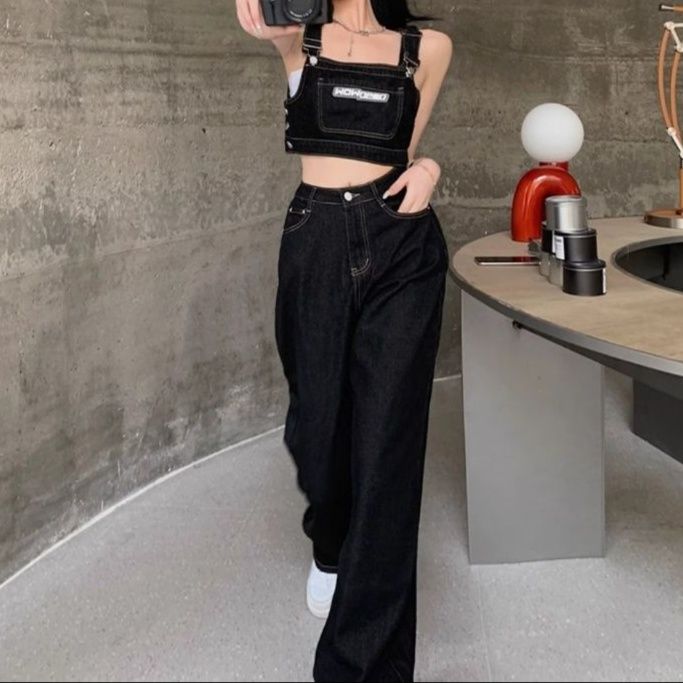 胸元のポケットとサスペンダーデザインがアクセントのビスチェトップスと、ゆったりとしたワイドシルエットのパンツの組み合わせ。