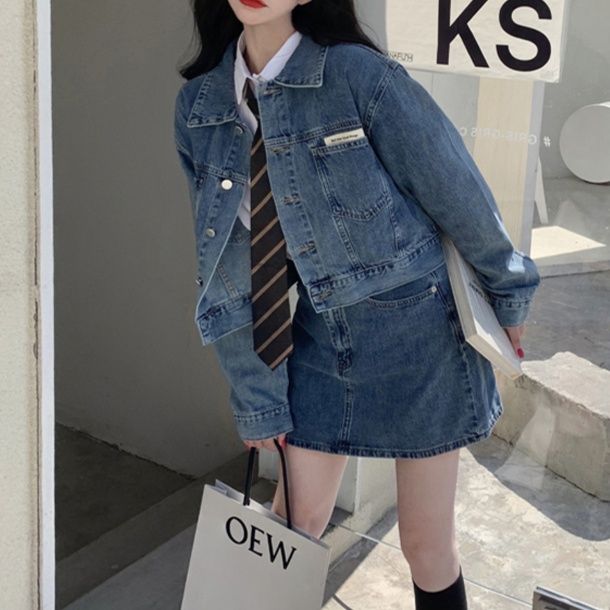 デニムジャケットとスカートの素材感を合わせた統一感のあるコーディネート