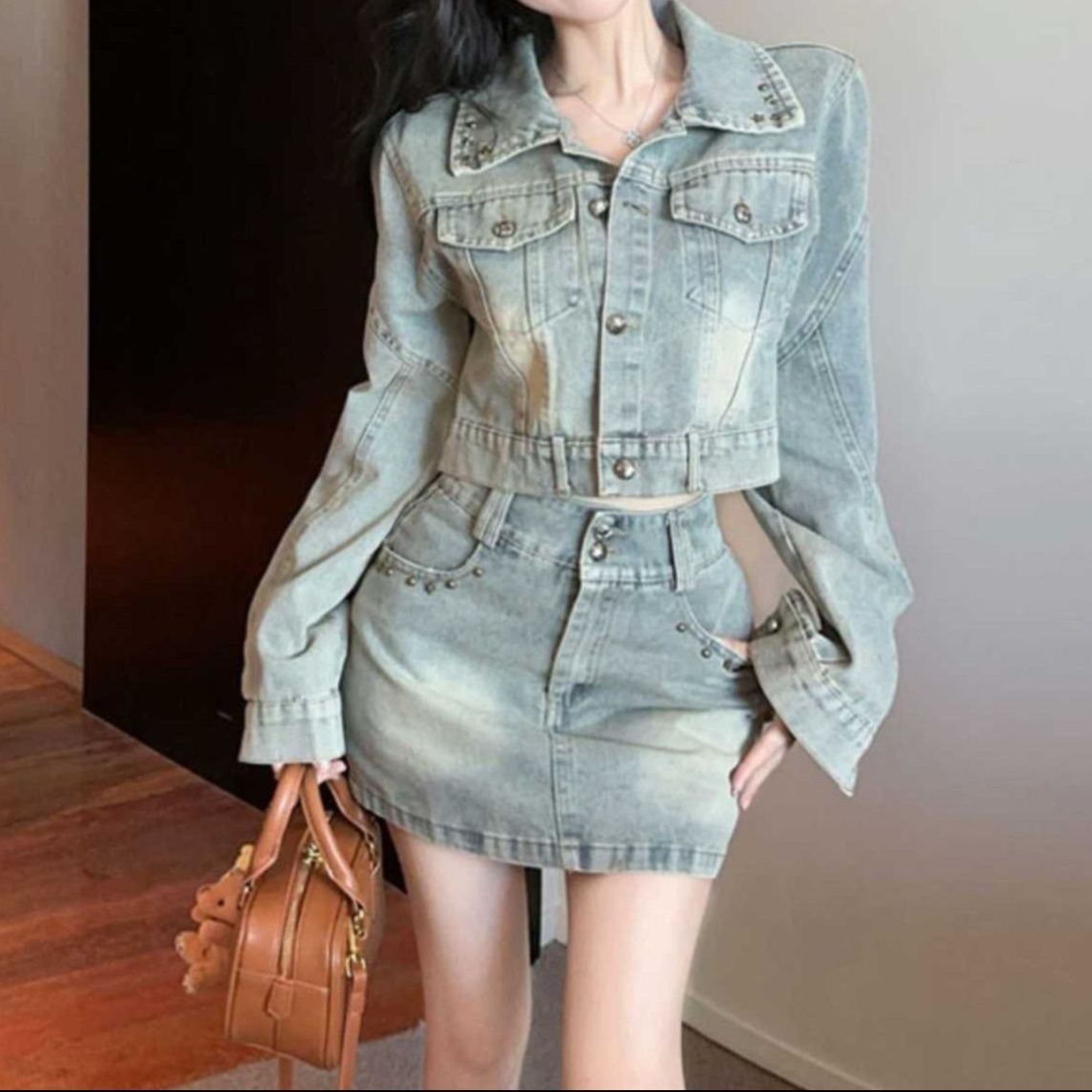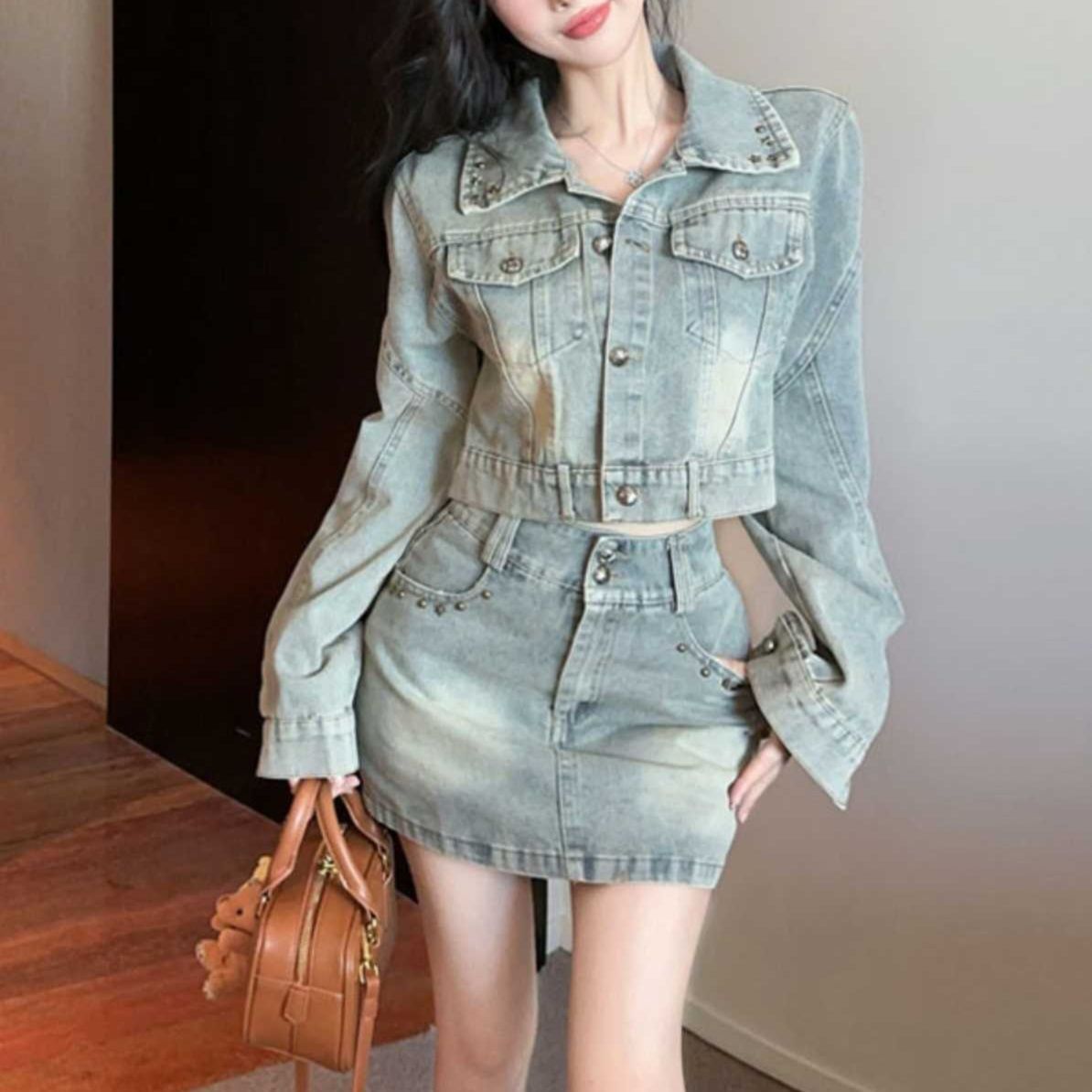 トレンド感あふれるデニムセットアップは襟元とポケットに施されたスタッズ装飾がポイントです。