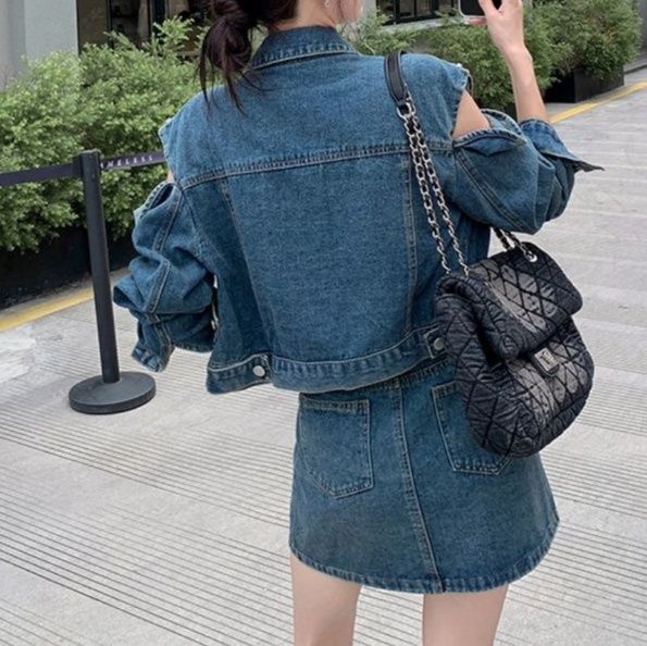コンパクトなオフショルジャケットとミニ丈スカートの組み合わせで、スタイルアップ効果も期待できます。