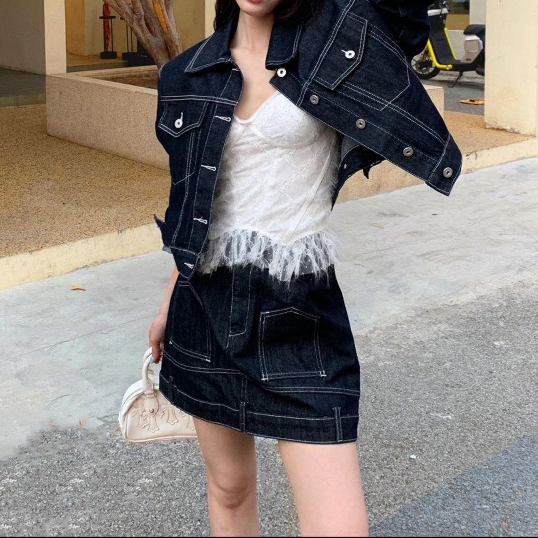 ジャケットのステッチが特徴的で、スカートセットアップとして上品さと可愛らしさを両立。