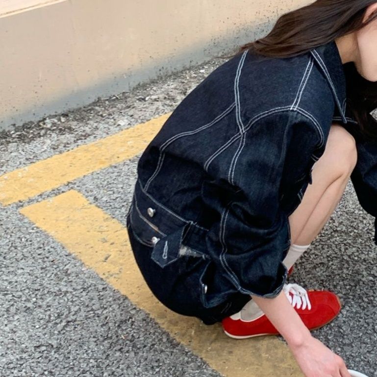 白いステッチがデニム生地の質感を引き立て、カジュアルながら洗練された印象に