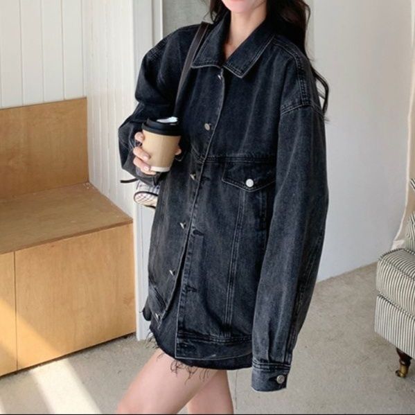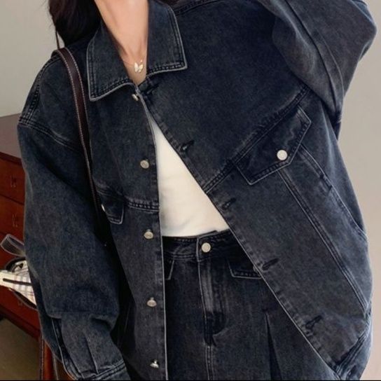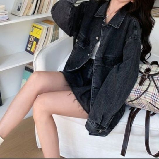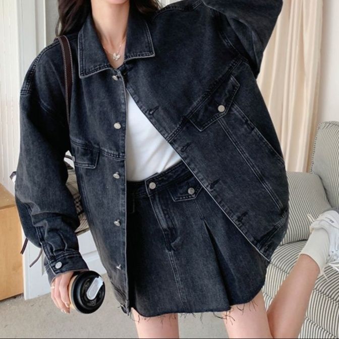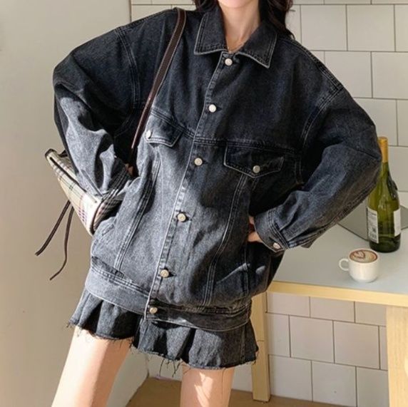 オーバーサイズのジャケットとミニスカートの組み合わせが魅力的なデニムセットアップ。