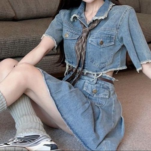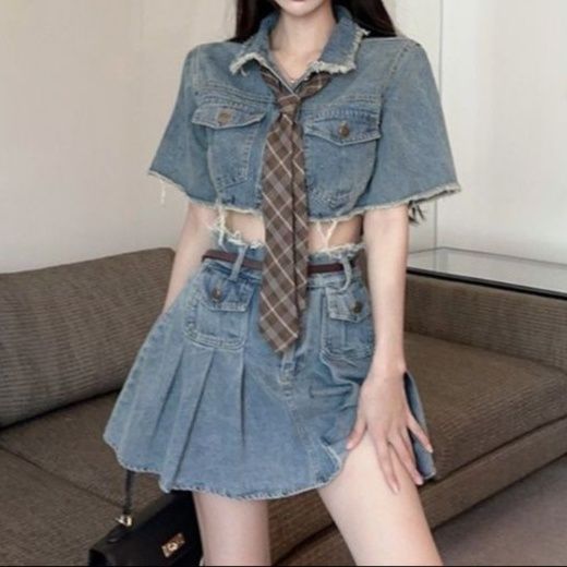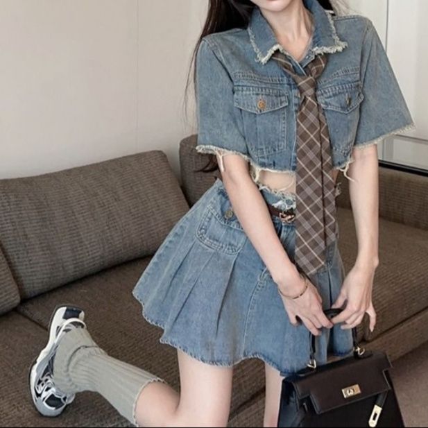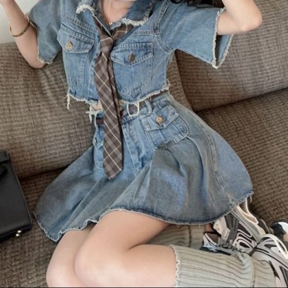デニムセットアップにネクタイを取り入れることで、遊び心のある大人可愛いコーディネートを完成させる