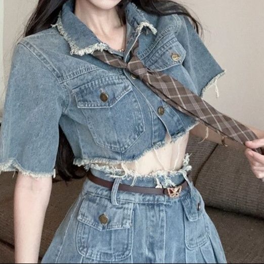 個性的な裾のフリンジ加工が目を引くデニムセットアップ。
