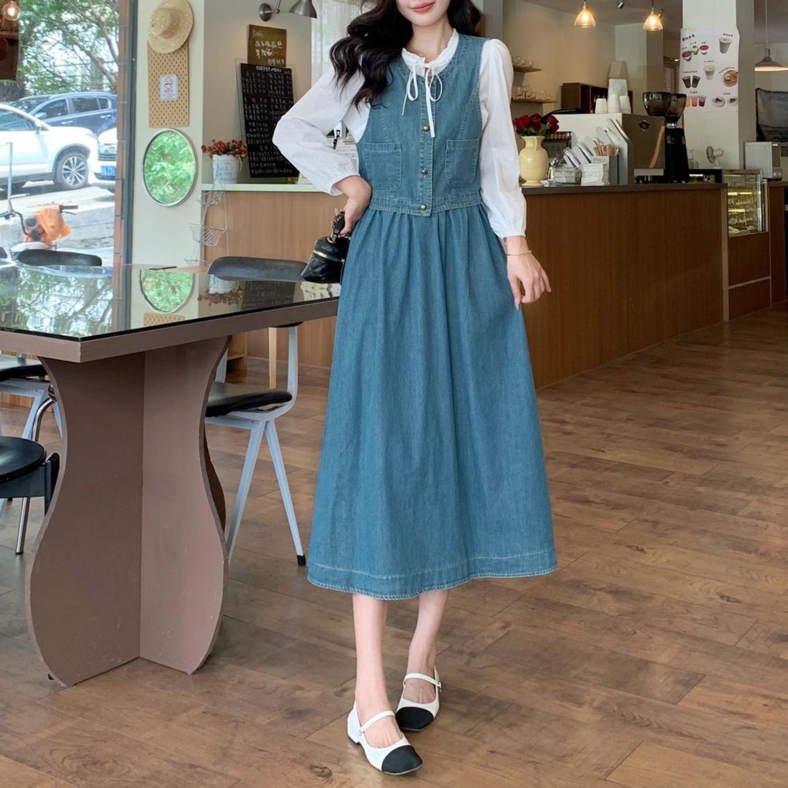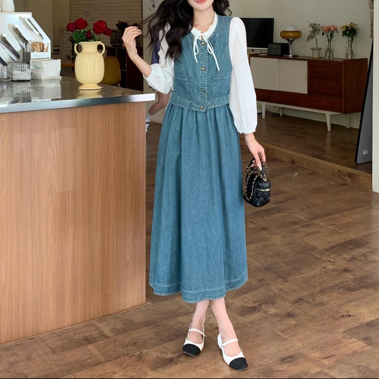デニムベスト、スカートと白ブラウスの組み合わせで、清楚で可愛らしい雰囲気を演出