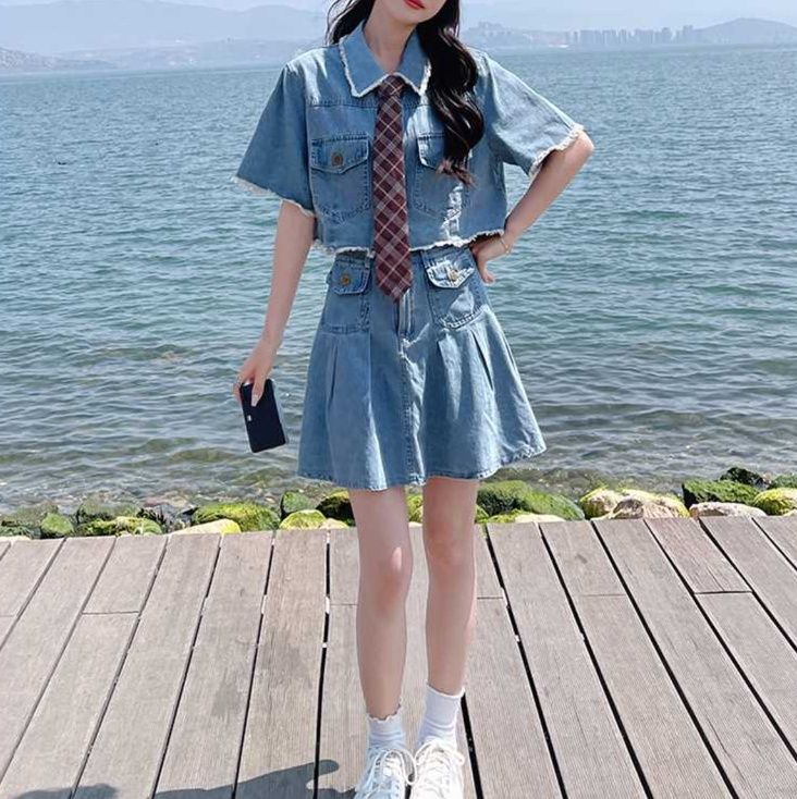 フレアスカートとトップスのデニム素材で爽やかな雰囲気を演出