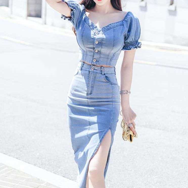 フェミニンなパフスリーブが可愛らしいショート丈トップスと、サイドスリット入りのタイトスカートを組み合わせたデニムセットアップです。