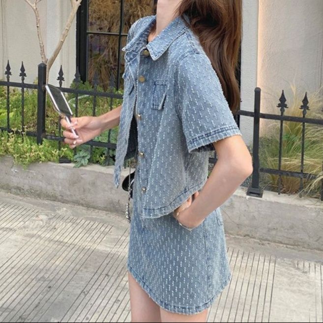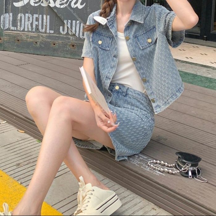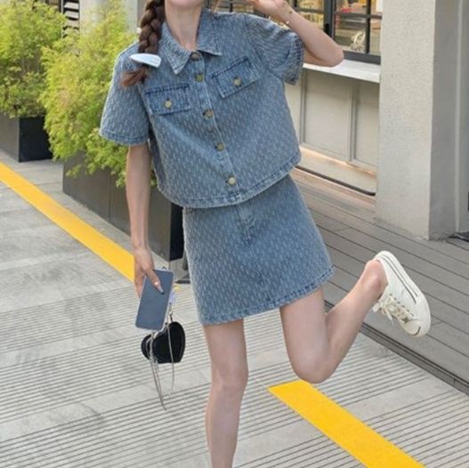 全体に散りばめられた柄が特徴的なデニムセットアップで、夏のお出かけにぴったりのアイテムです。