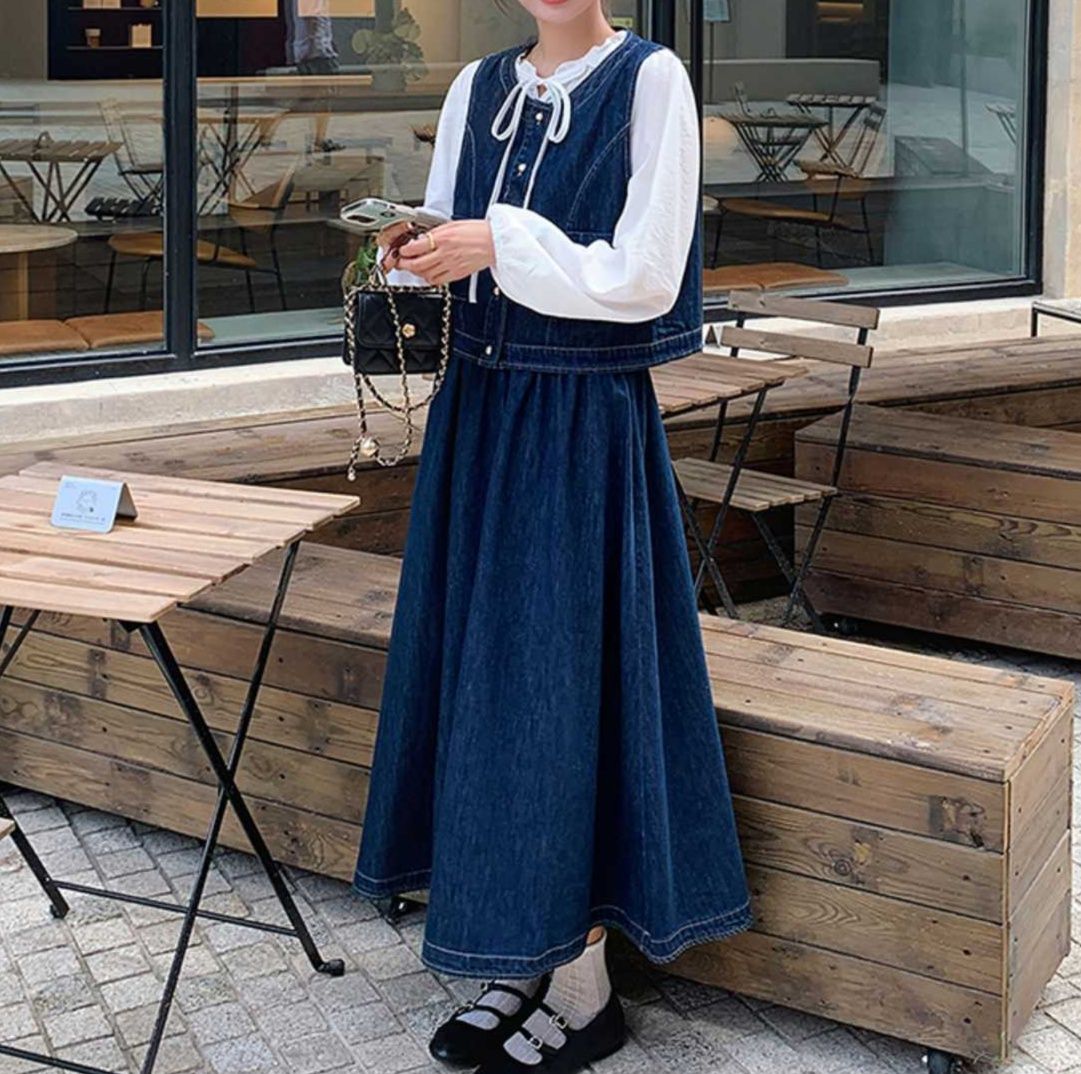 フレアシルエットのデニム素材が懐かしさと可愛らしさを演出