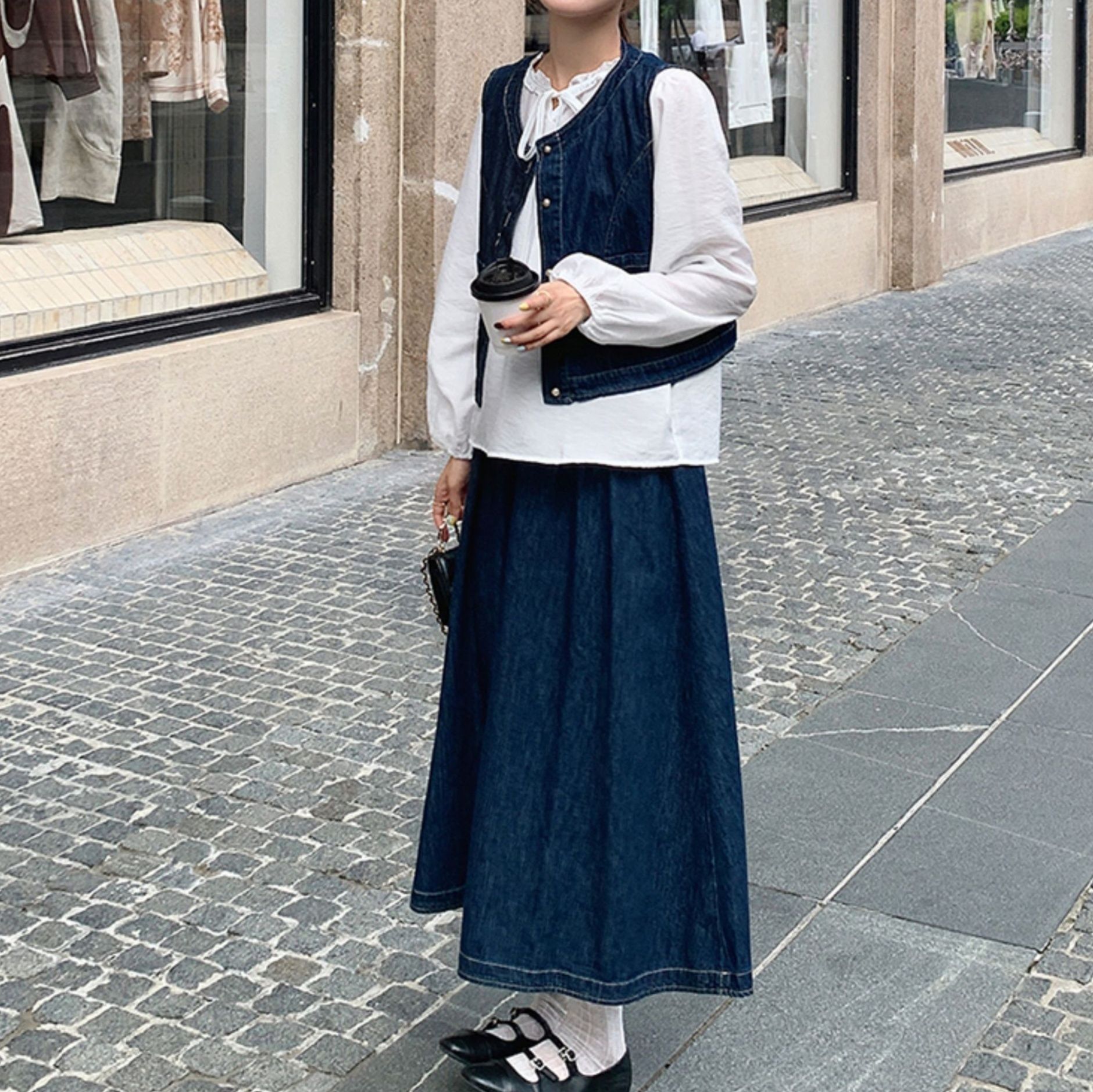 すっきりとしたベストとフレアシルエットのロングスカートが組み合わさり、こなれ感のある着こなしが叶います。