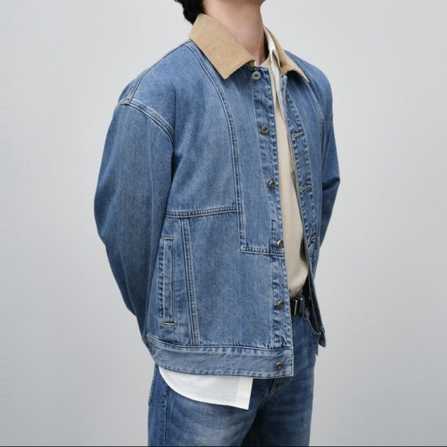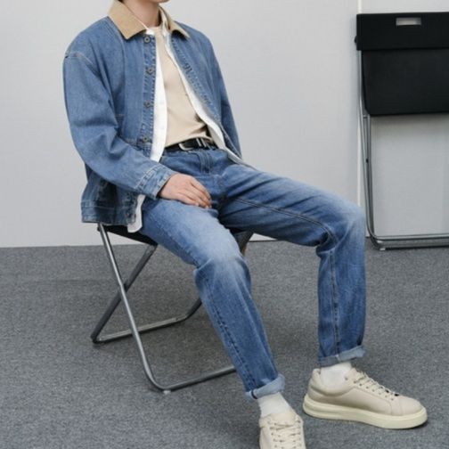 デニムジャケットの襟の配色がカジュアルな中にも洗練された印象を演出