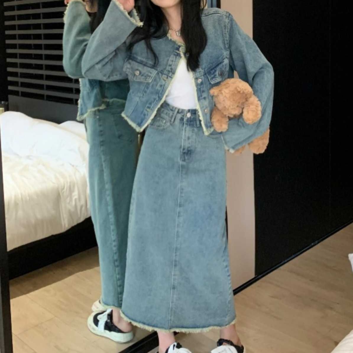 短めのジャケットとロングスカートの組み合わせで、カジュアルながらも女性らしいシルエットを実現。