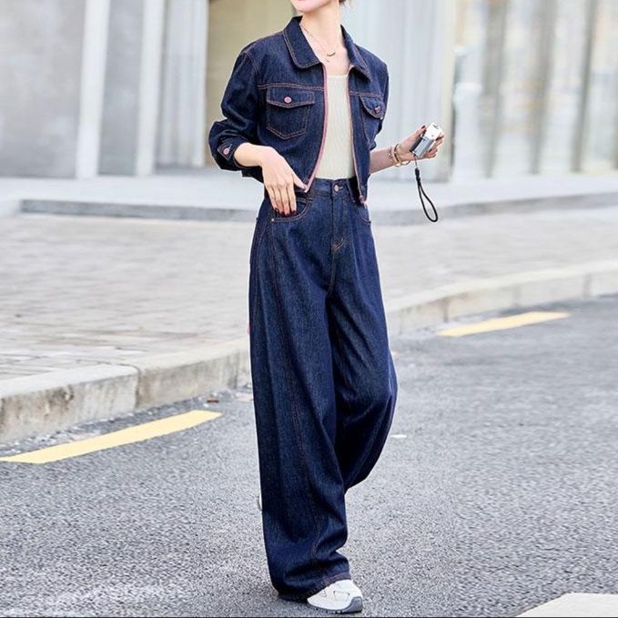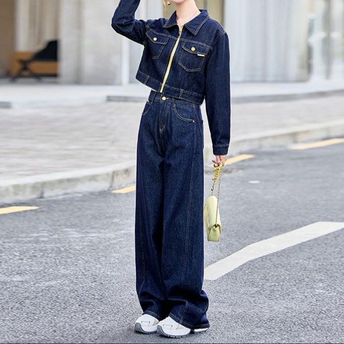 ショート丈のジャケットとゆったりとしたワイドシルエットのパンツを組み合わせたデニムセットアップは、一枚で決まるおしゃれアイテムです。