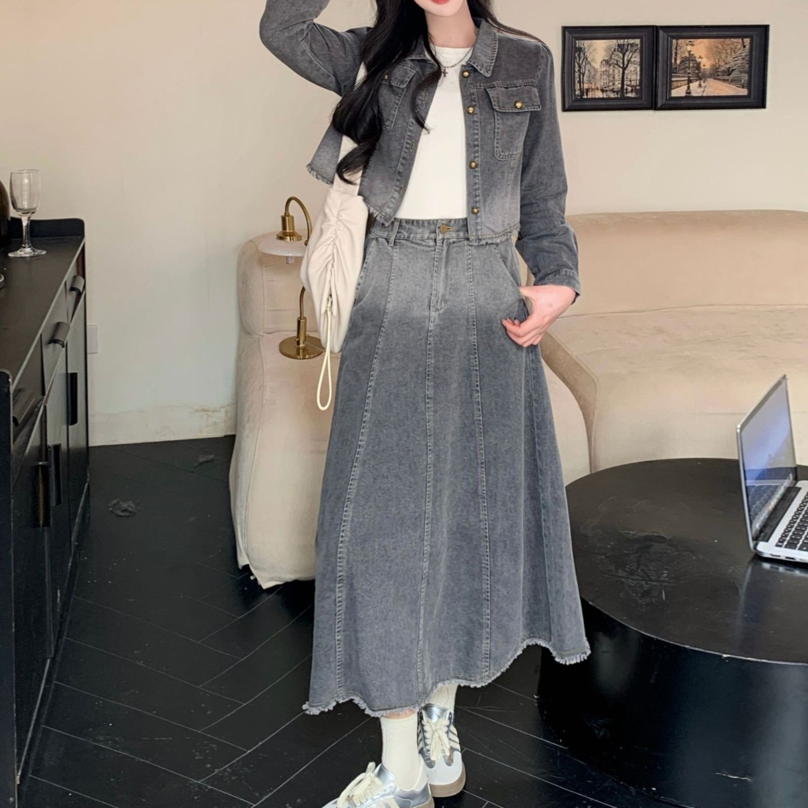 トレンドのスカートセットアップで、ショート丈のデニムジャケットとロング丈のフレアスカートが魅力的なデニムセットアップです。