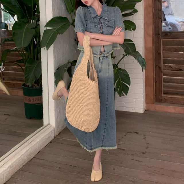 短めのパフスリーブトップスとロング丈のスカートを組み合わせた、スカートセットアップで女性らしいシルエットを演出します。