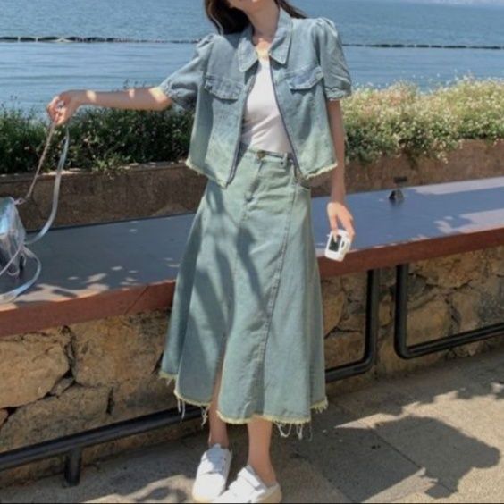短めの半袖トップスとすっきりとしたロング丈スカートの組み合わせが新鮮で、こなれた雰囲気を演出します。
