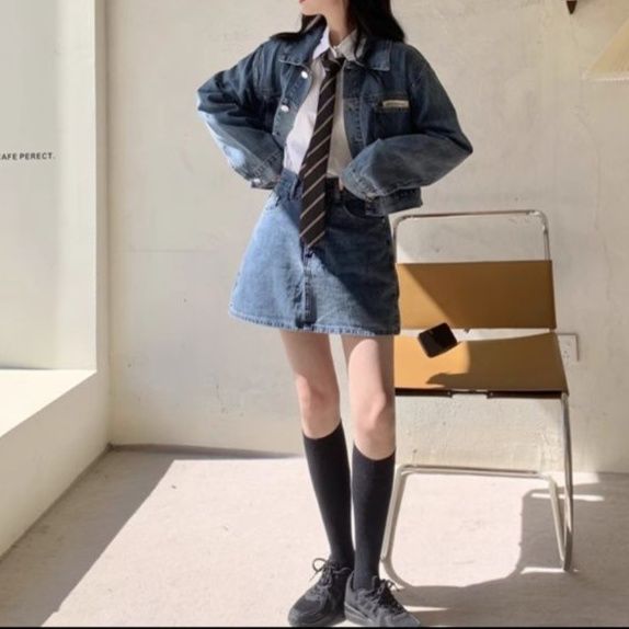 クラシカルな雰囲気漂うデニムセットアップ。短め丈のジャケットとミニスカートの組み合わせが、大人かわいい印象を演出します。