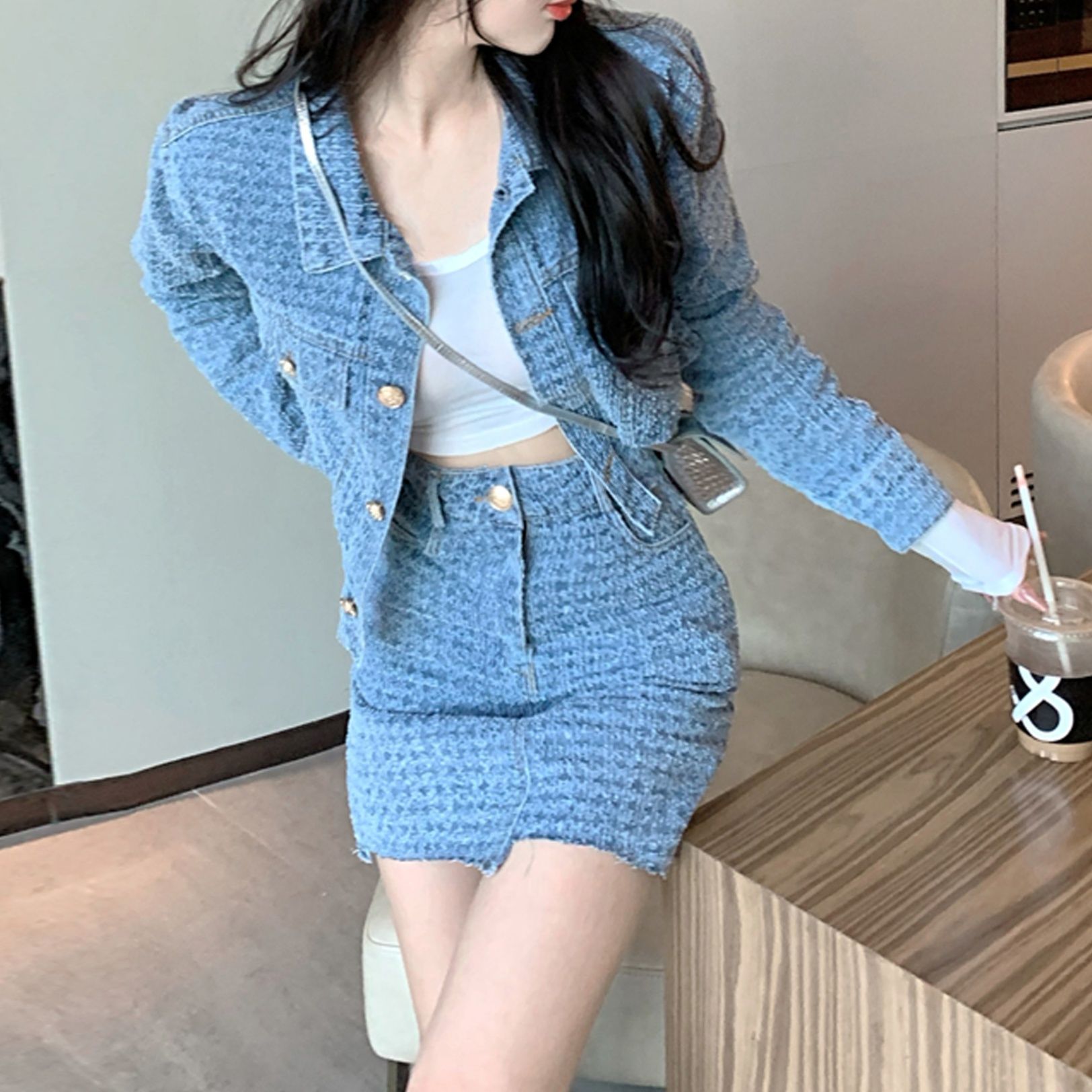 トレンドのツイード調の柄が目を引くデニムセットアップです。