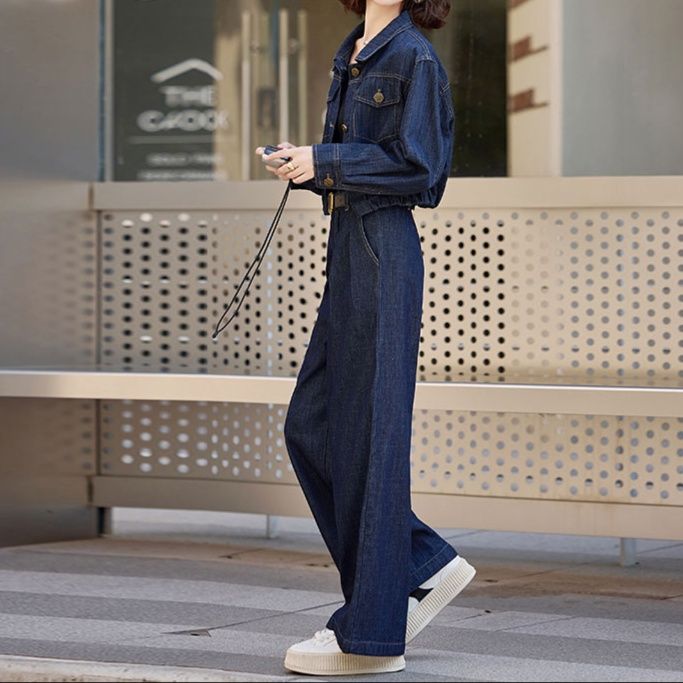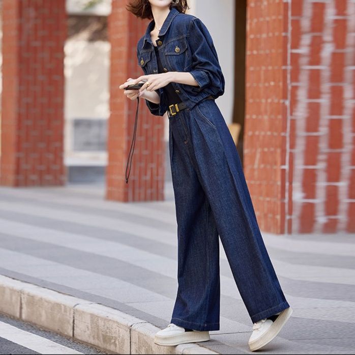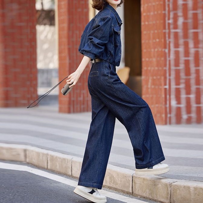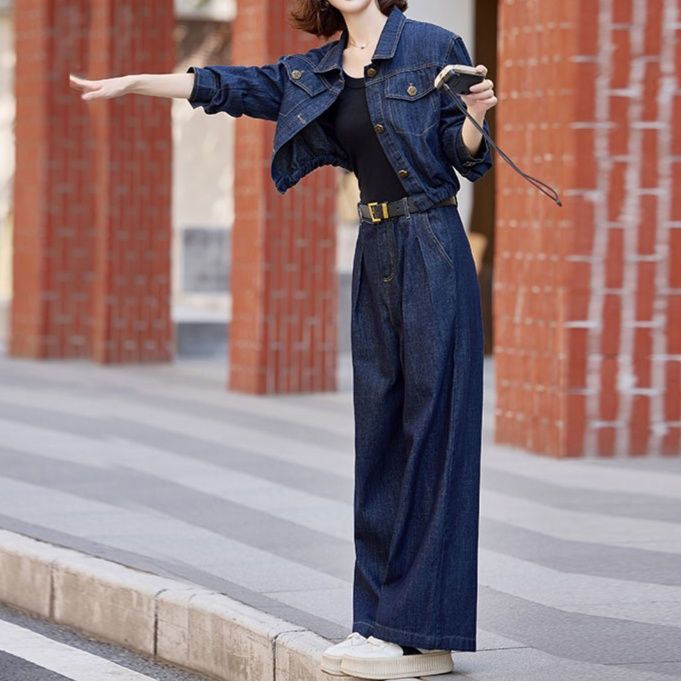 トレンド感溢れるショート丈のジャケットと、ゆったりとしたワイドパンツを組み合わせたデニムセットアップです。