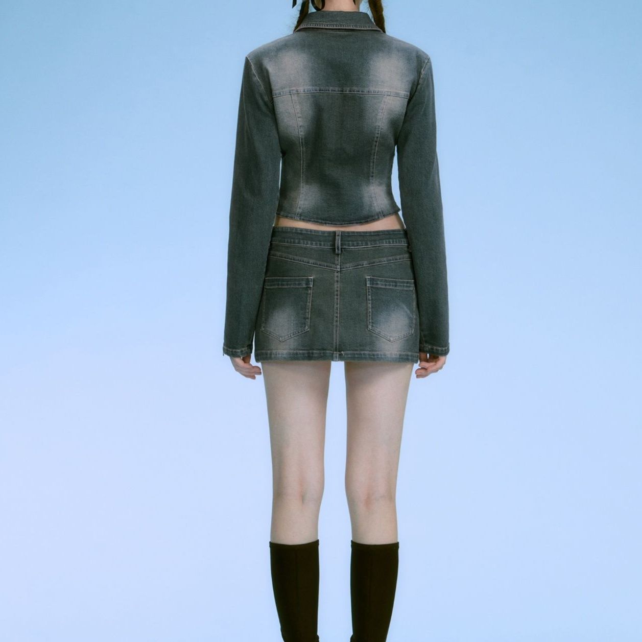 腰回りにフィットするデザインで、すっきりとした印象を与えるデニムセットアップです。