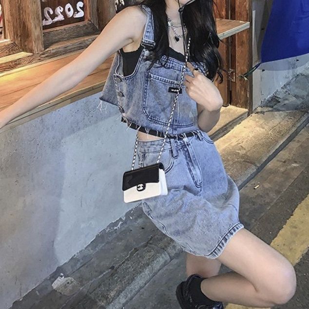 クロップド丈のサロペ風ビスチェとミニスカートの二点セットで、デニムセットアップならではのこなれ感を演出します。
