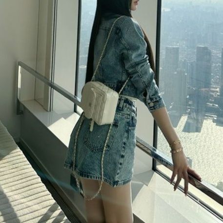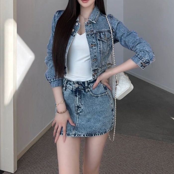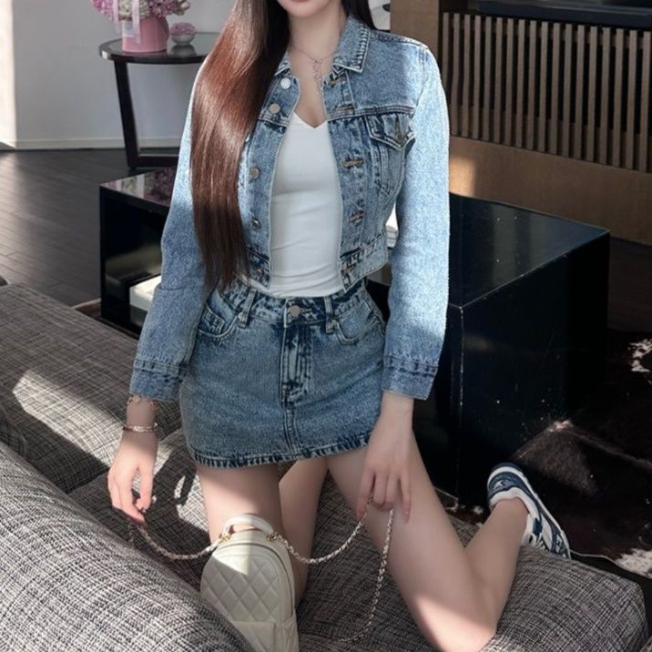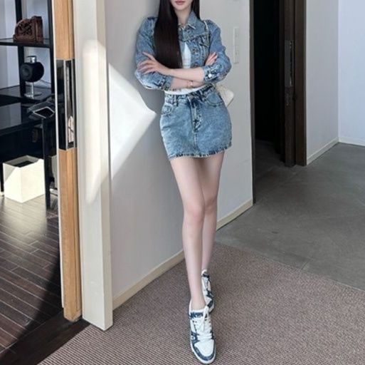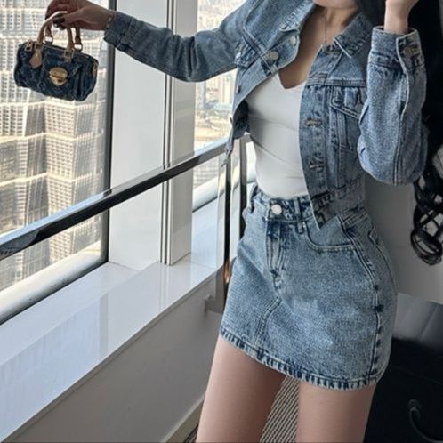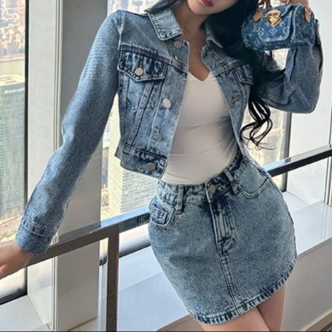 デニムセットアップの新定番、ショート丈ジャケットとミニ丈スカートの組合せ。
