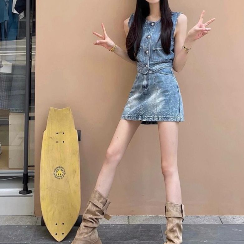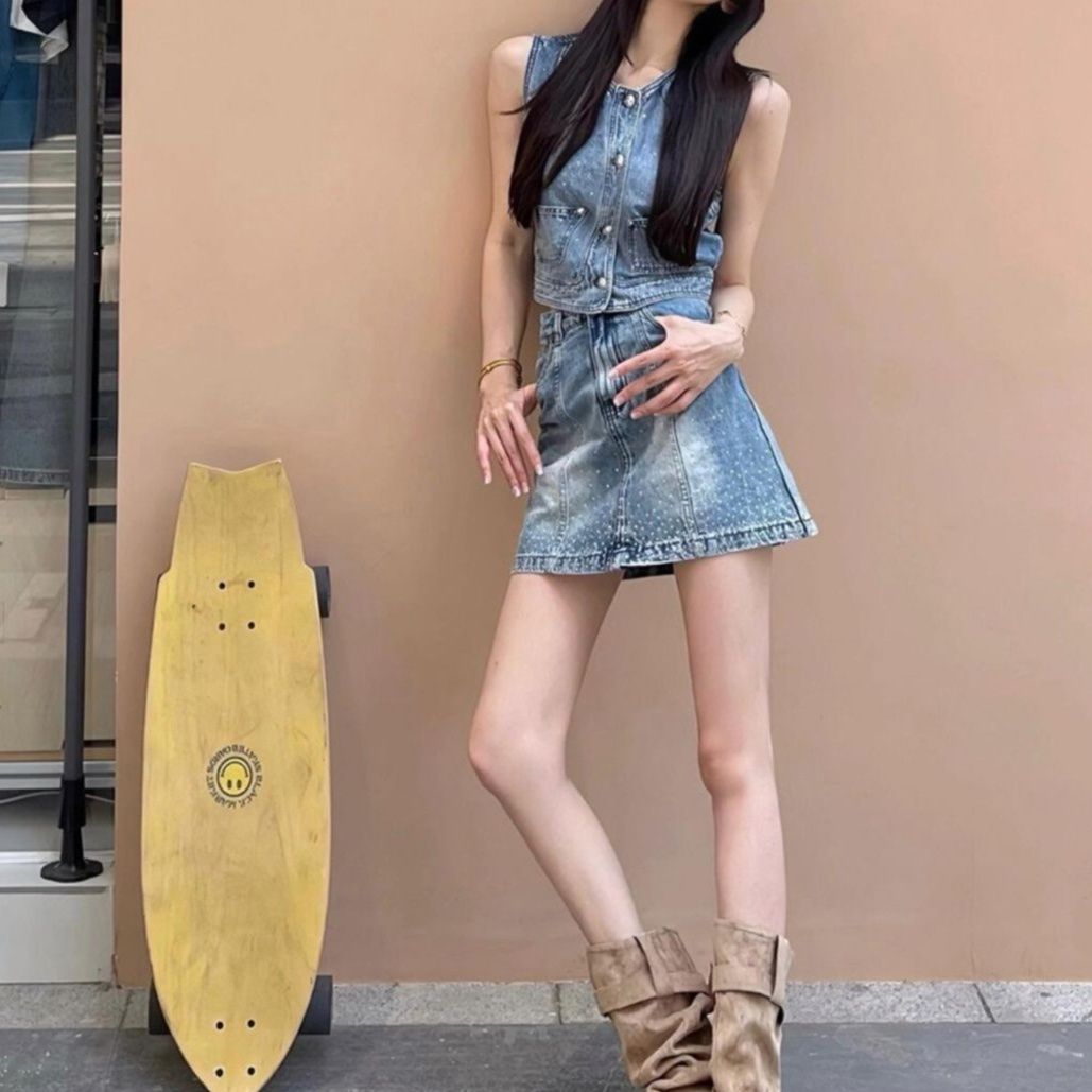 コンパクトなベストと台形シルエットのミニスカートの二点セットです。