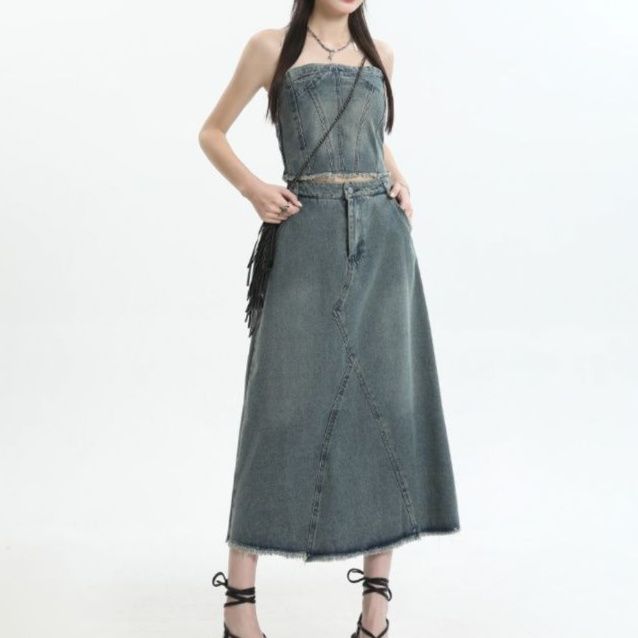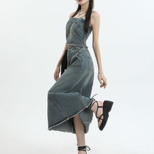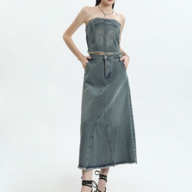 フリンジ装飾が施されたビスチェトップスとロング丈のスカートを組み合わせたデニムセットアップです。