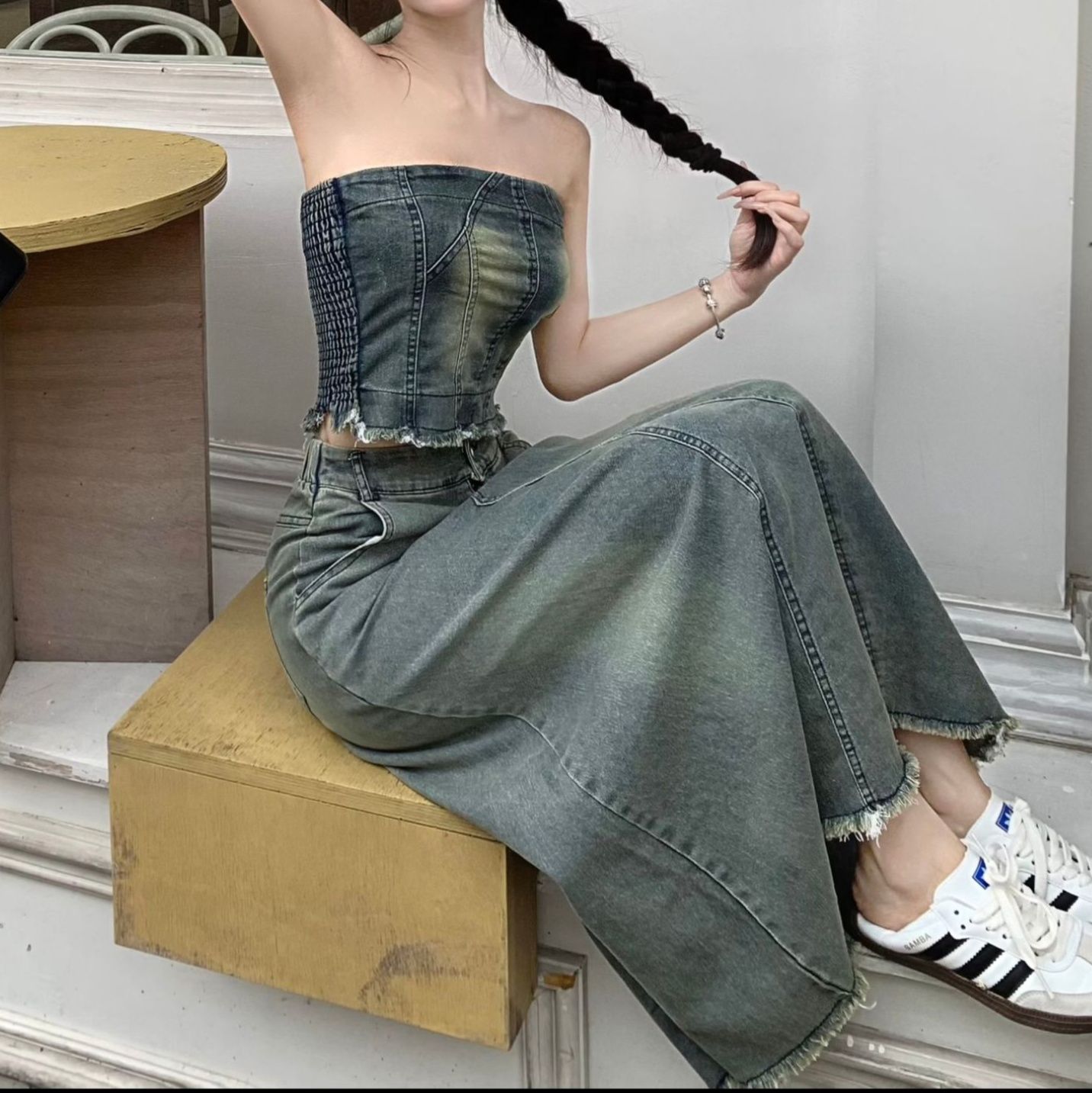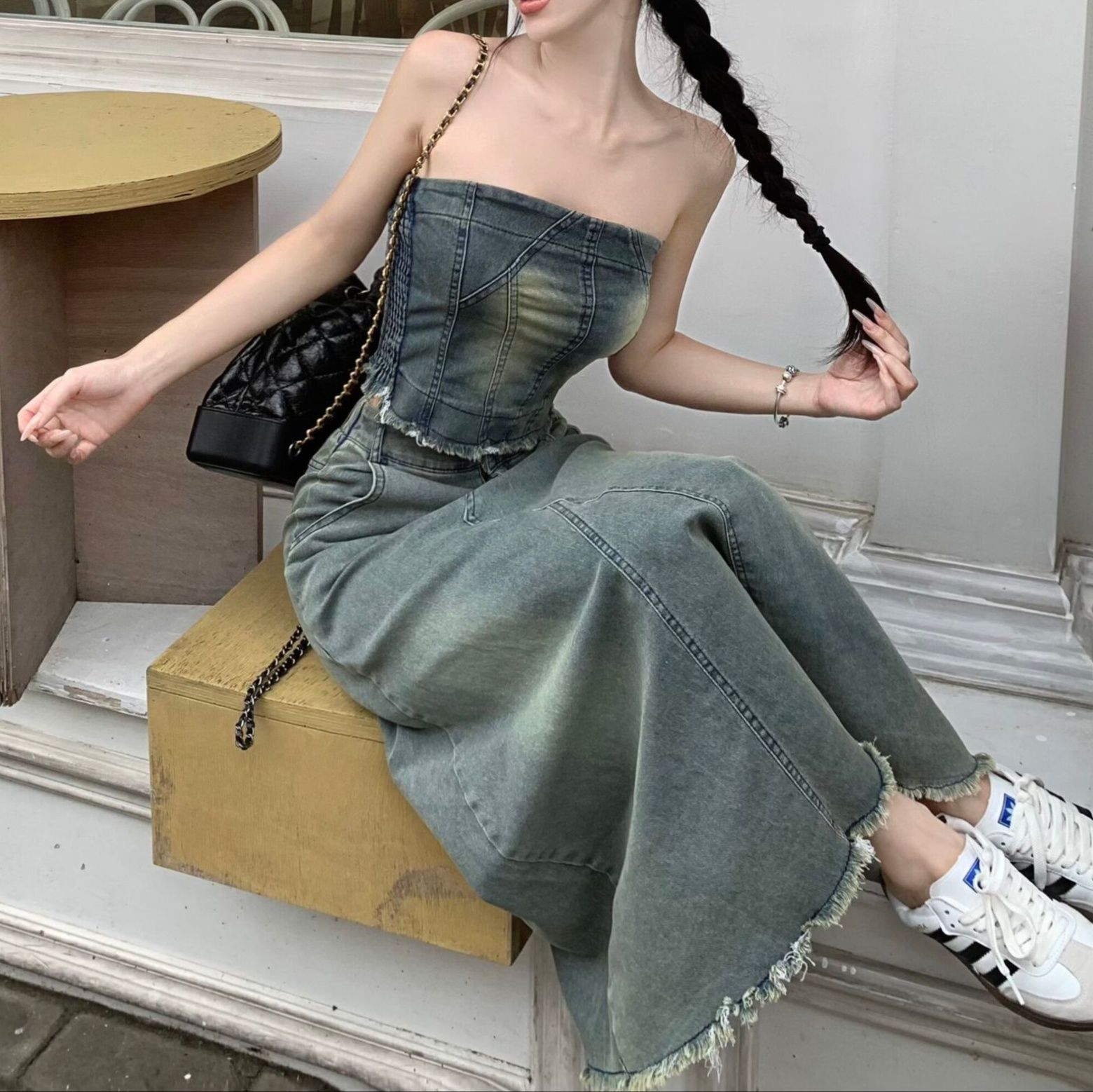 ビスチェとロングスカートの組み合わせが、女性らしさとカジュアルさを両立させます。