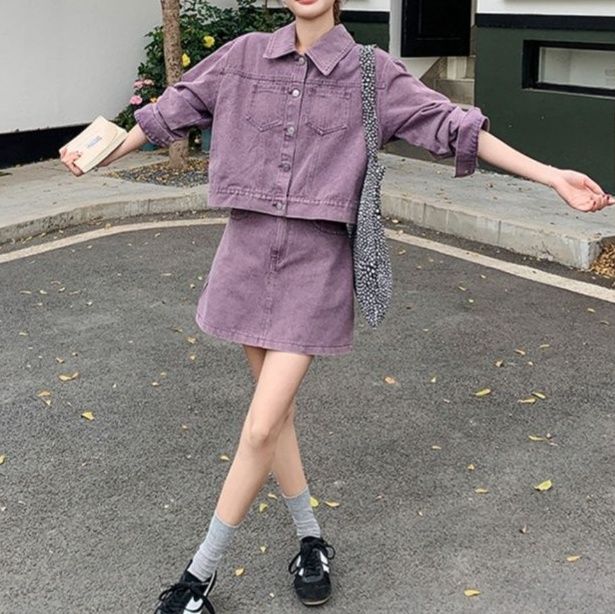 短めのミニスカートとのバランスが絶妙で、カジュアルながらも上品な印象を与えるデニムセットアップです。