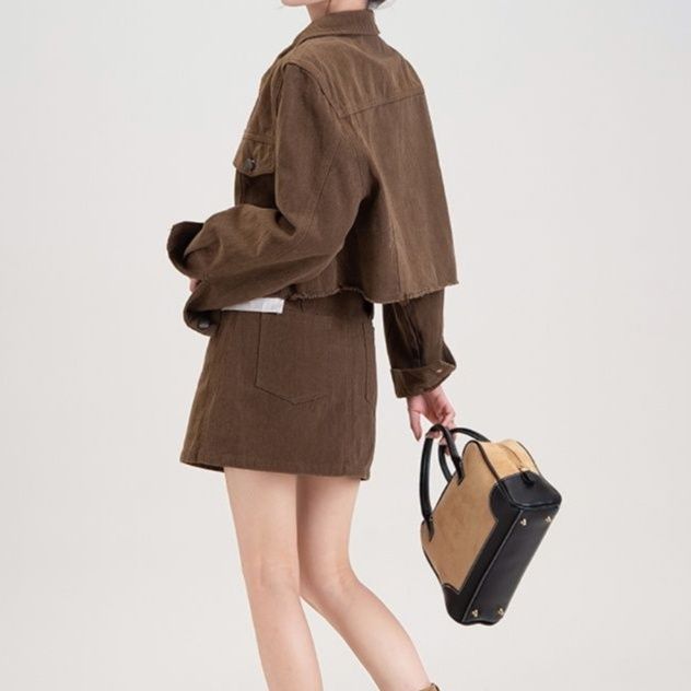 ショートジャケットとミニスカートの組み合わせで、すっきりとしたシルエットを演出