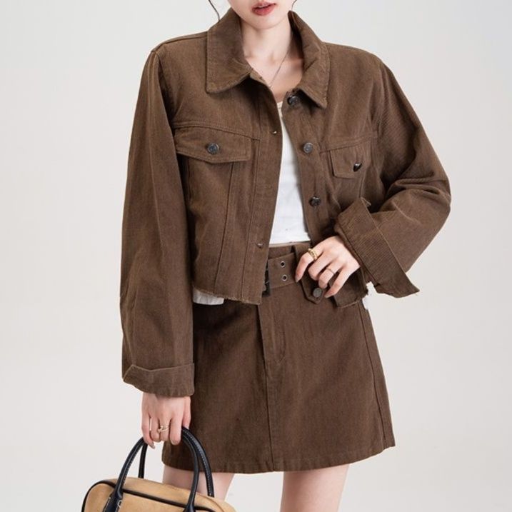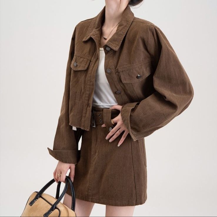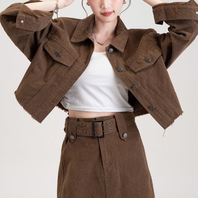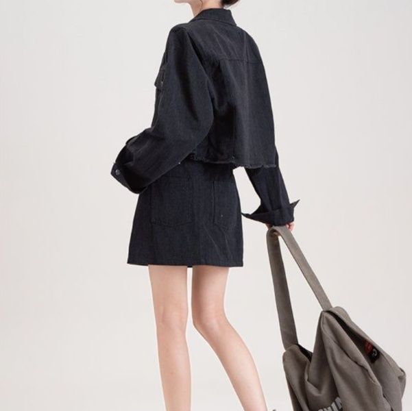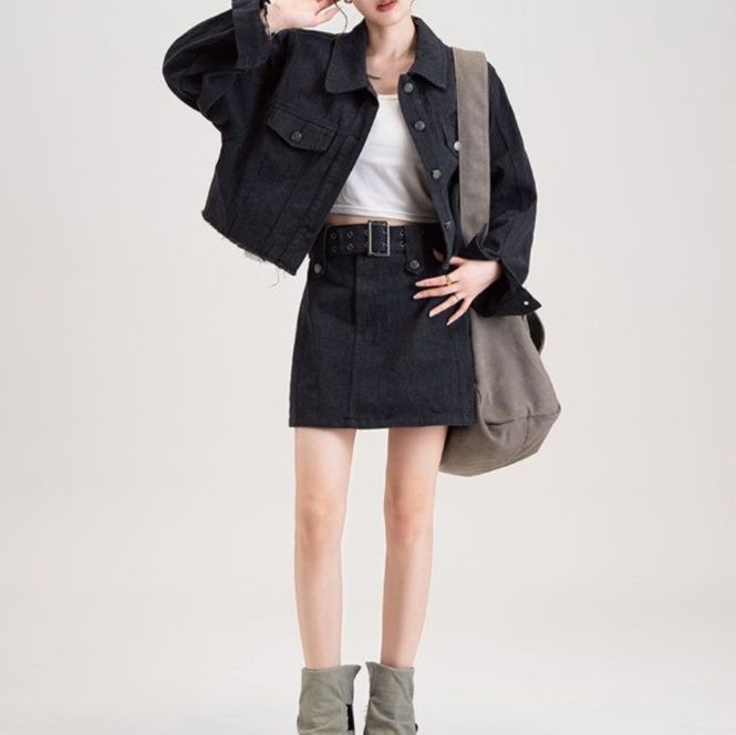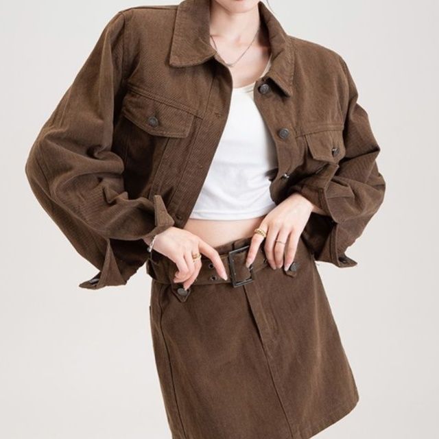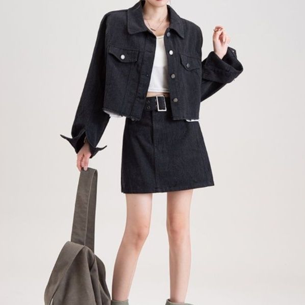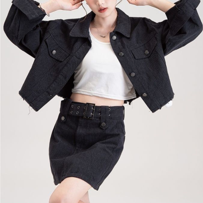 ショート丈のジャケットと台形シルエットのミニスカートがセットになったデニムセットアップで、カジュアルながらも洗練された印象を演出します。