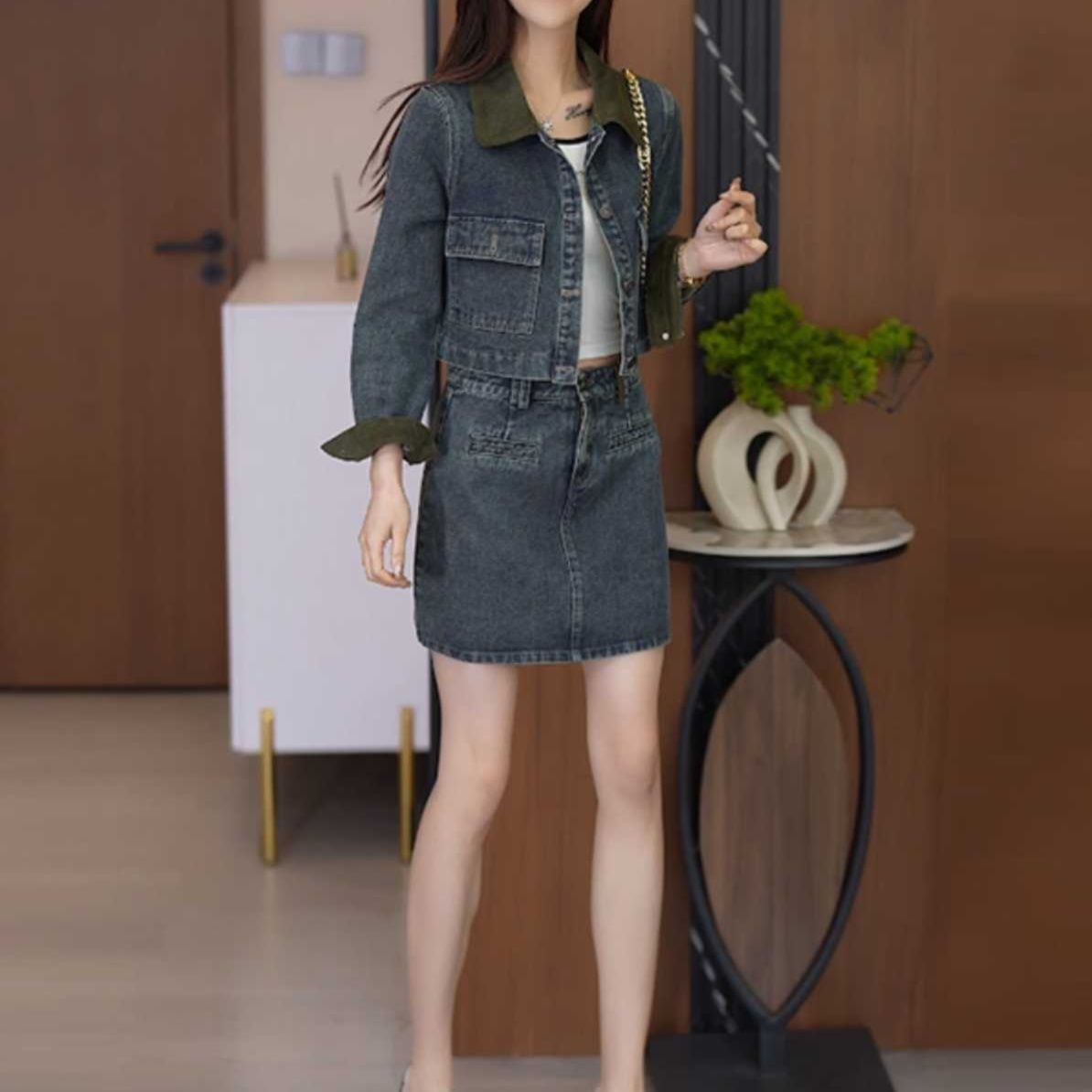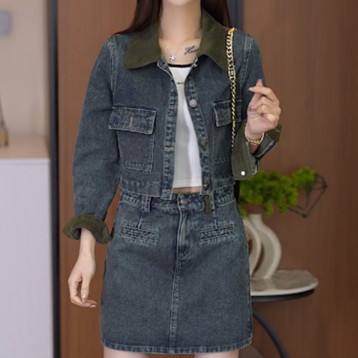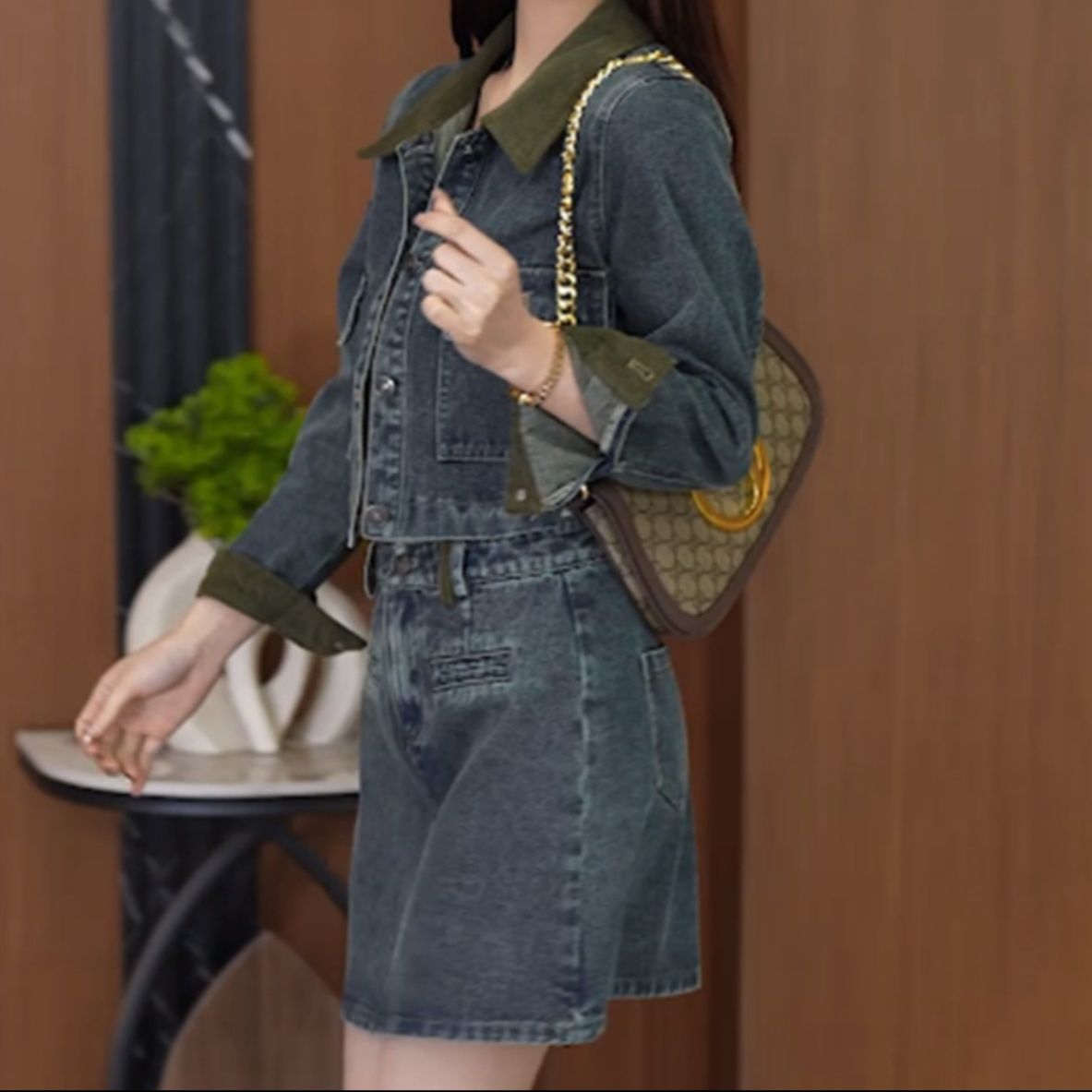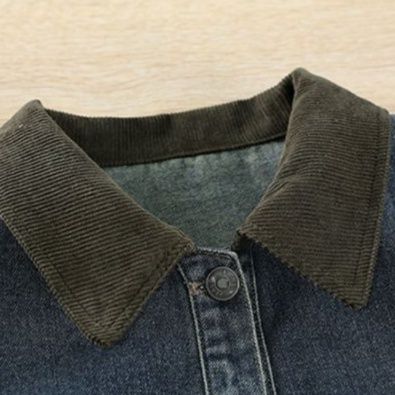 デニムジャケットに施された異素材の襟がデザインのポイントとなり、カジュアルながら洗練された印象に