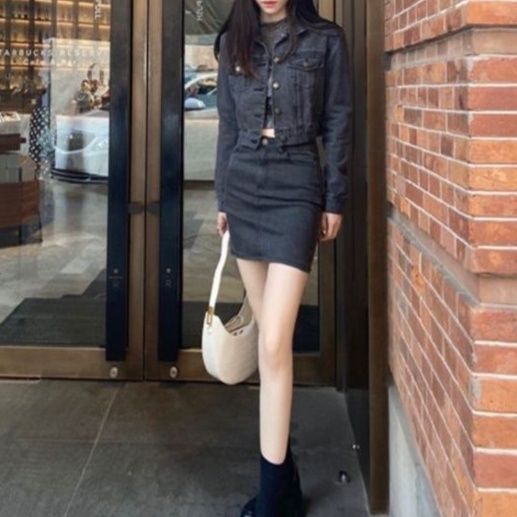 ジャケットとスカートで同系色のデニムを合わせることで統一感のあるコーディネートに