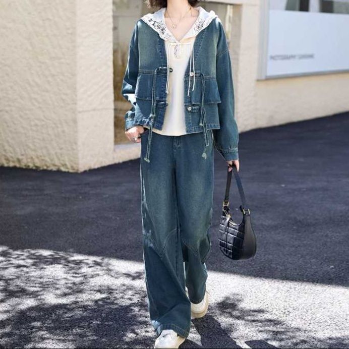 可愛らしいレース襟パーカーもセットでお得なジージャンセットアップです。