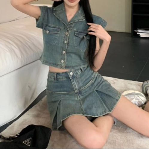 キャップスリーブのショート丈トップスとプリーツデザインのミニスカートを組み合わせた、トレンド感あふれるスカートセットアップ。
