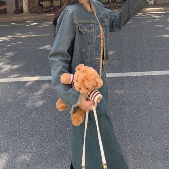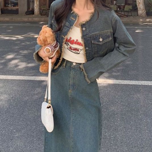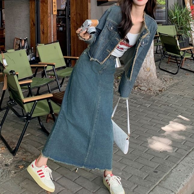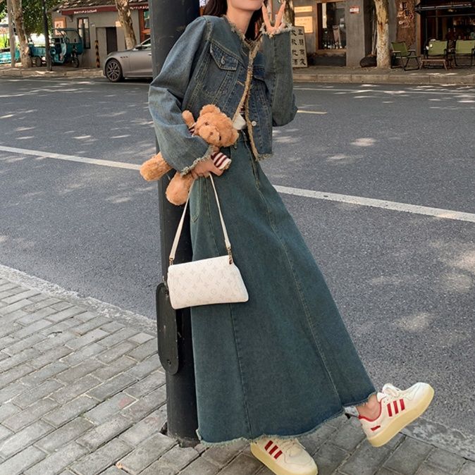 トレンド感溢れるデニムセットアップは、ショート丈のジャケットとロング丈のスカートの組み合わせが魅力的です。