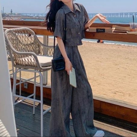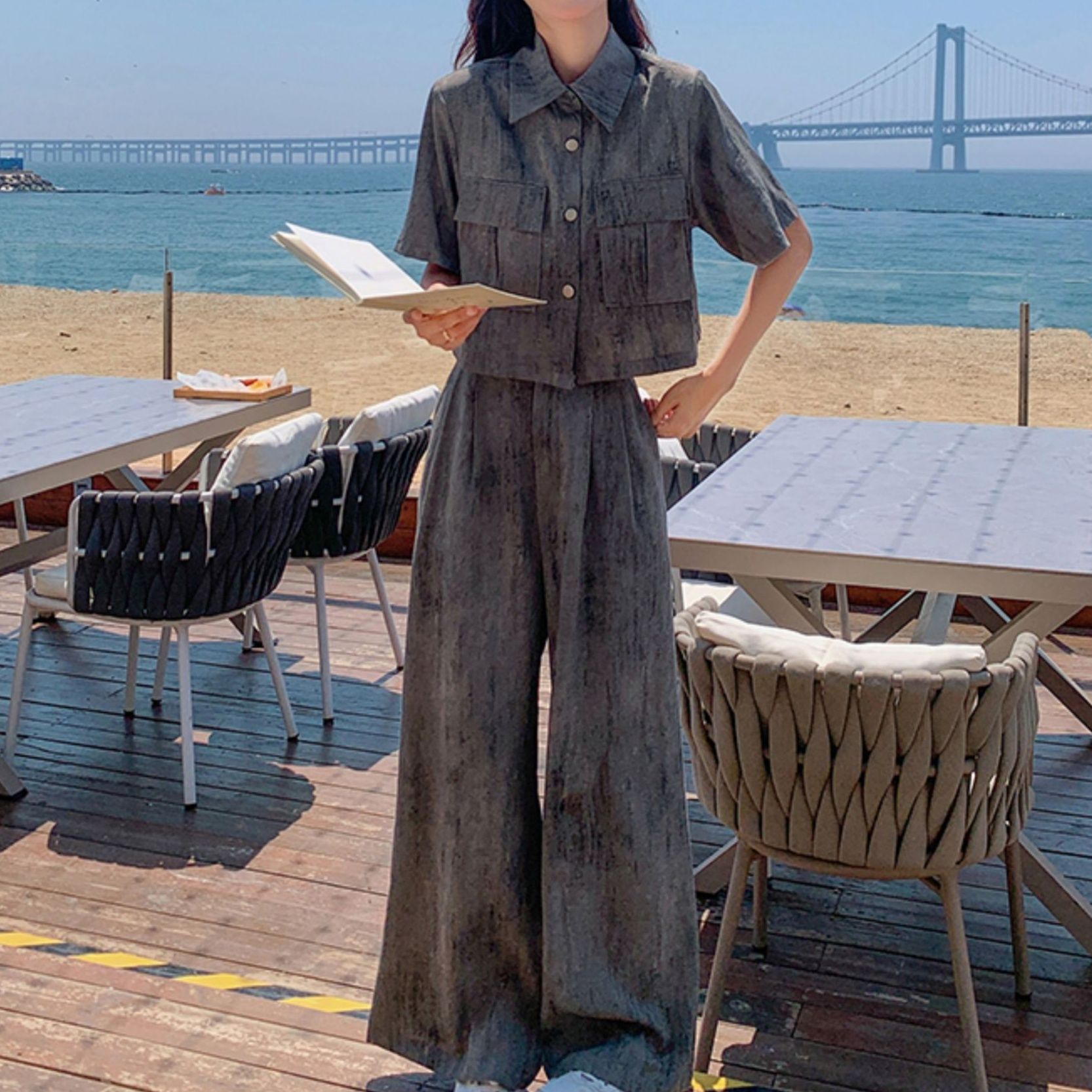 こなれ感たっぷりのデニムセットアップは、半袖ショートシャツジャケットとゆったりワイドパンツの組み合わせが魅力です。