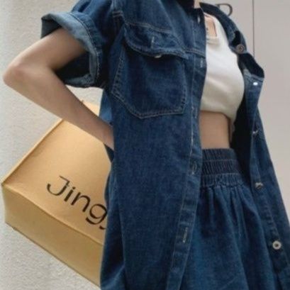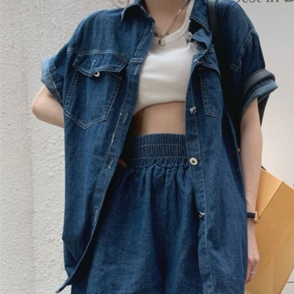 こなれ感溢れるデニムセットアップは、ゆったりとした半袖シャツと楽ちんウエストのショートパンツの組み合わせ。