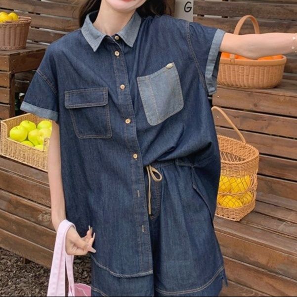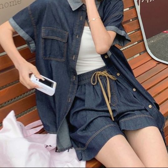 カジュアルで洗練されたデニムセットアップは、シャツとショートパンツの二点セットです。