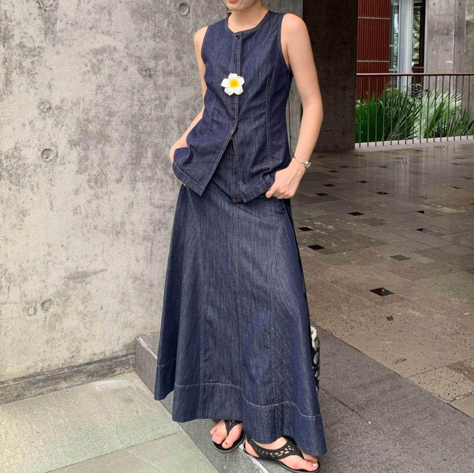 すっきりとしたノースリーブトップスと上品なロング丈スカートを組み合わせたデニムセットアップです。