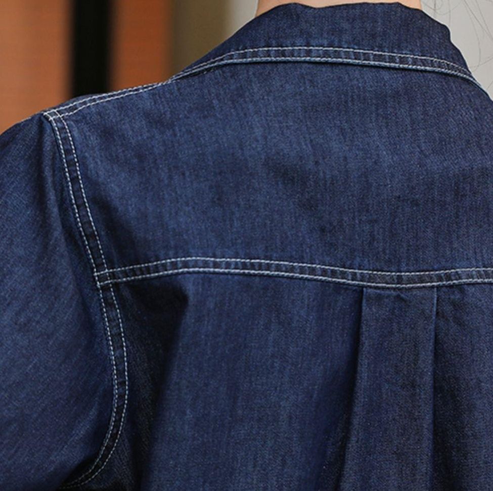 半袖のデニムシャツには胸元の機能的なポケットとステッチが施され、こなれ感を演出します。