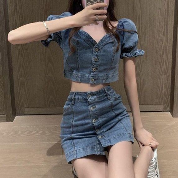 愛らしいパフスリーブのトップスと前ボタンデザインのスカートが特徴的なスカートセットアップです。