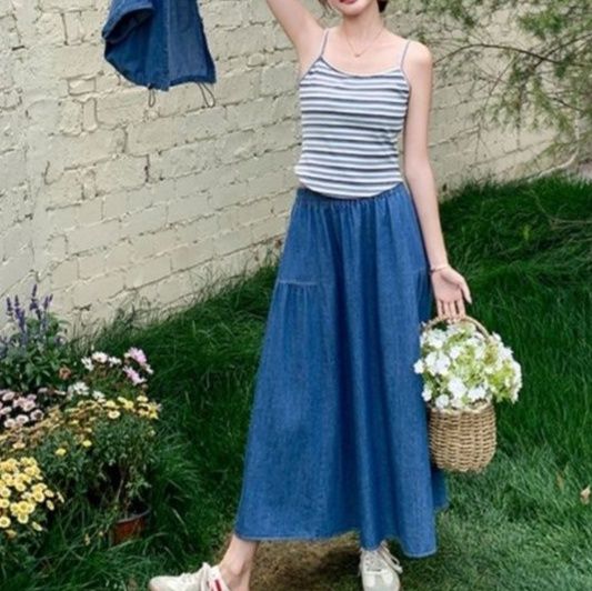 半袖のシャツジャケットとキャミトップス、ゆったりとしたロングスカートの組み合わせで、リラックス感のある着こなしが楽しめます。