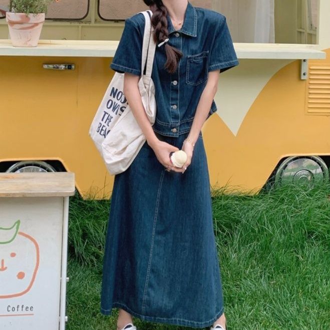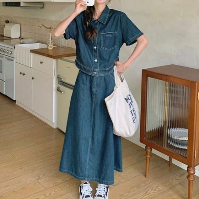 上品な風合いの生地で仕立てたデニムセットアップ。短め丈の半袖シャツジャケットと緩やかなフレアのロング丈スカートで、女性らしい柔らかな印象に。