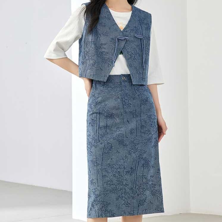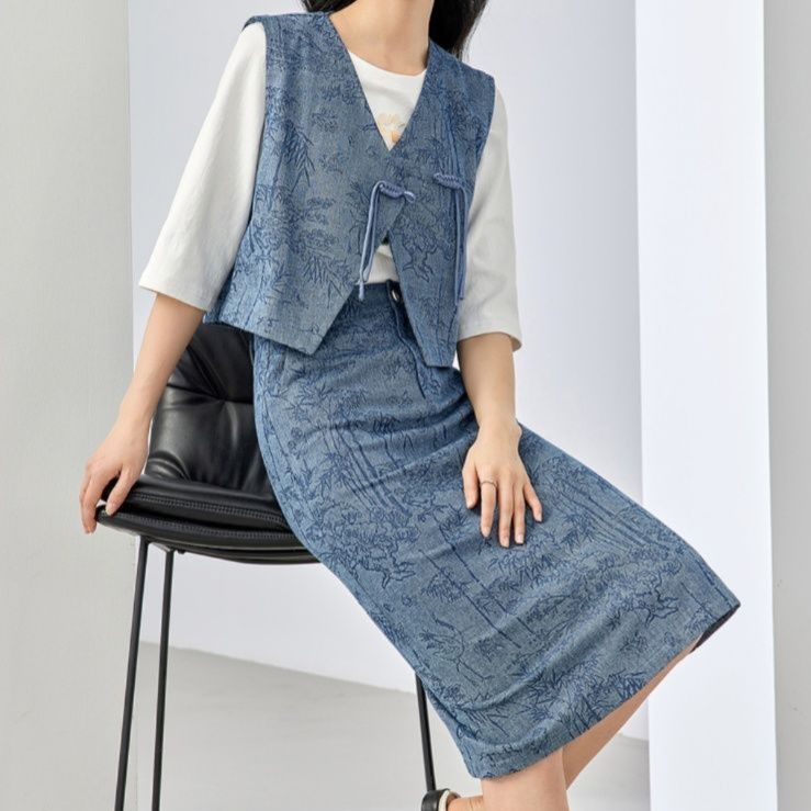 短丈のベストとタイトスカートの組み合わせが、女性らしいシルエットを演出します。