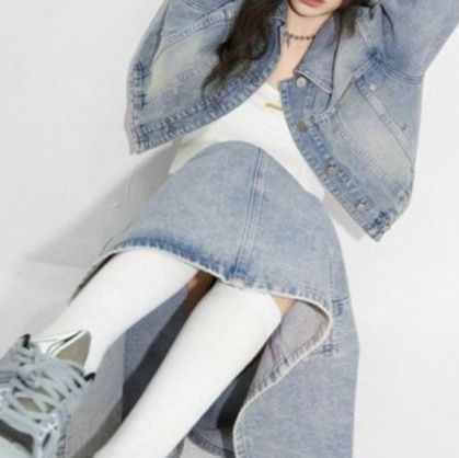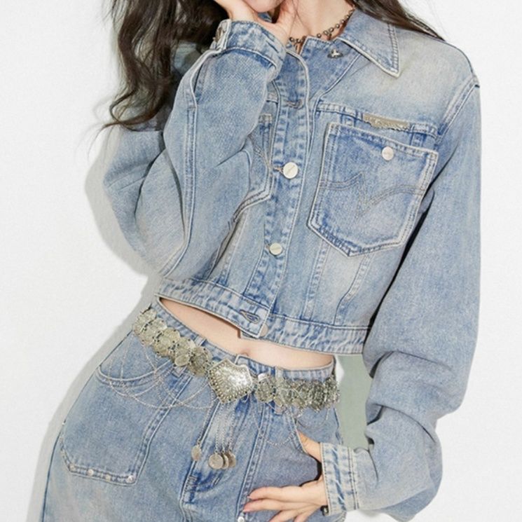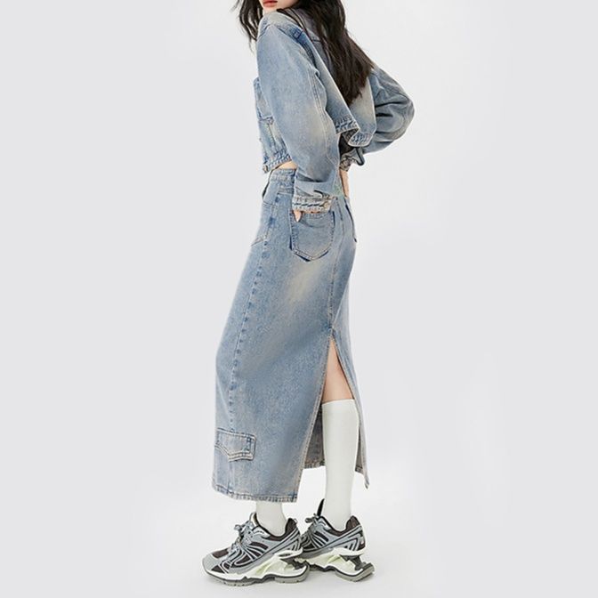 カジュアルで洗練されたデニムセットアップは、ショート丈のジャケットとロング丈のスカートを組み合わせです。